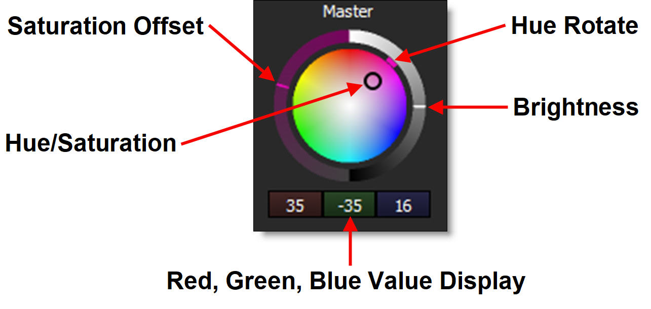 Note: The Hue and Saturation adjustments are achieved by simultaneously changing the Red, Green and Blue parameters in the respective group: Master, Shadows, Midtones, or Highlights. The current Red, Green and Blue values are displayed below the Color Wheel.