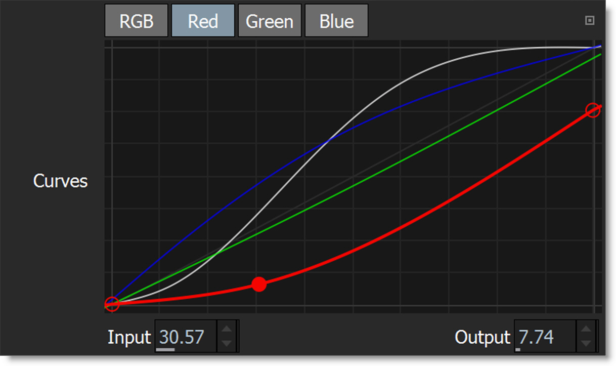 • To lighten the shadows, move a point near the bottom of the curve upward. Moving a point either up or to the left maps a lower input value to a higher output value, and the image lightens.
