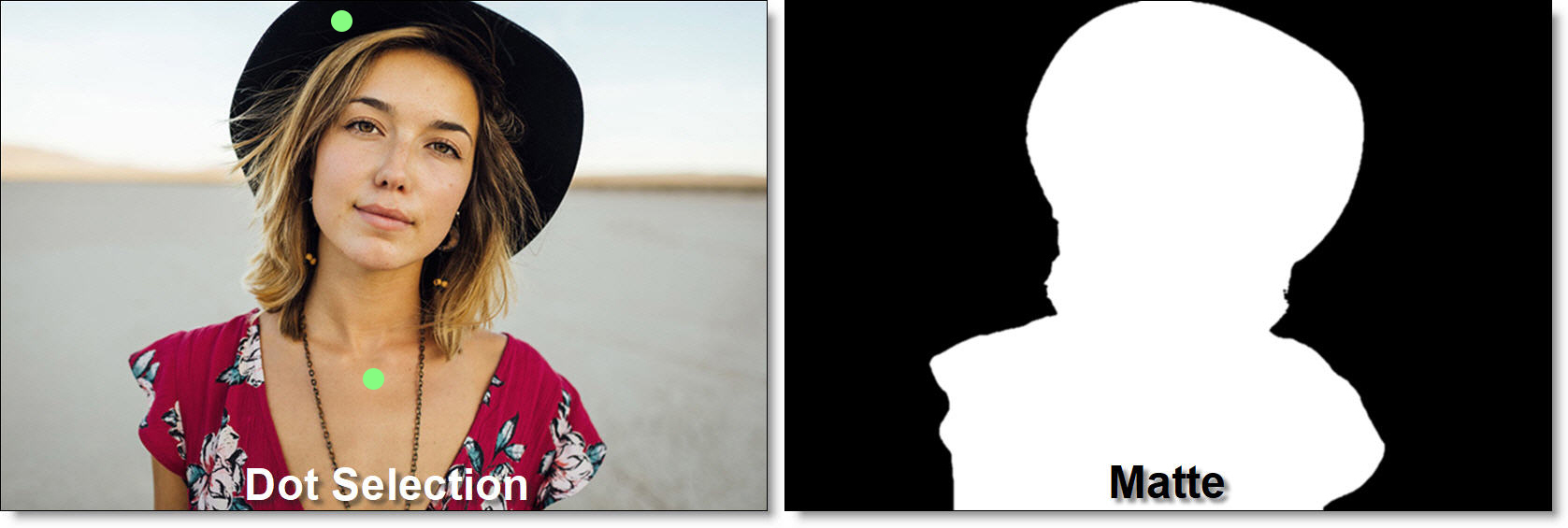 Mask ML is an easy to use point and click matte generator utilizing machine learning object segmentation. A single click selects a defined segment of the image while successive clicks add adjacent areas to the object. Mattes are created on single frames and are useful as input to the Matte Assist ML node where the matte is propagated over time or to limit strokes in the Paint node.