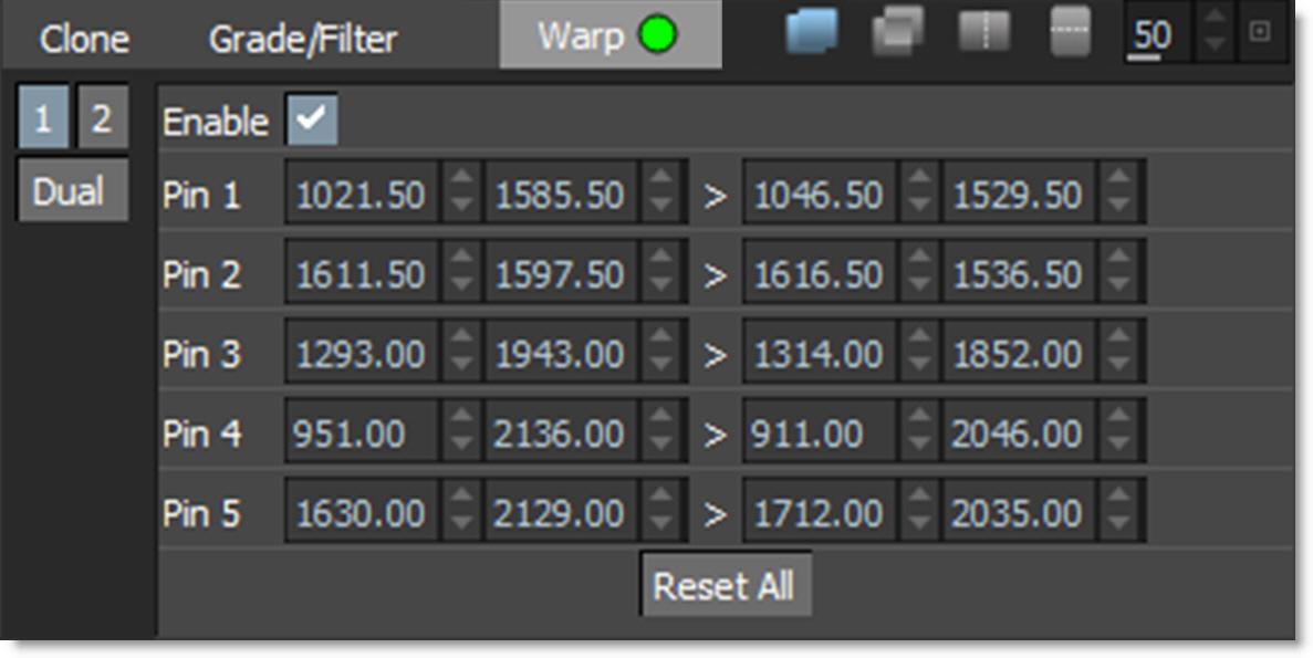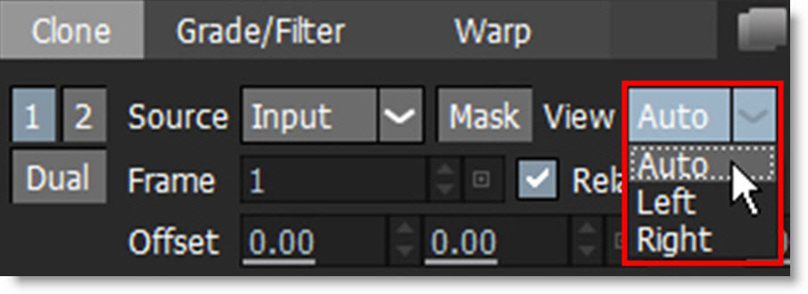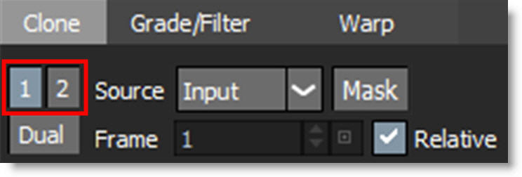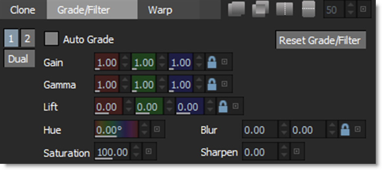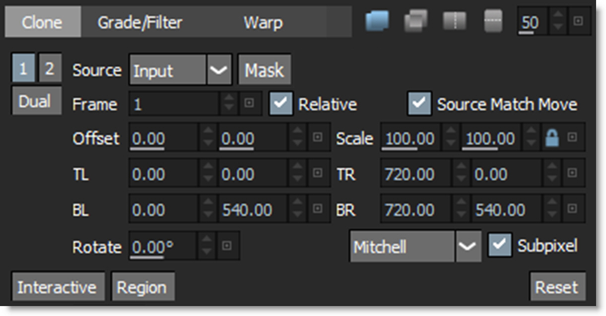 The controls for the Clone brush are split into three tabs: Clone, Grade/Filter and Warp. The Clone tab deals with the selection, timing and transformation of the clone source. The Grade/Filter tab contains color correction (grade), blur and sharpening parameters. Last, the Warp tab has warp related controls.
