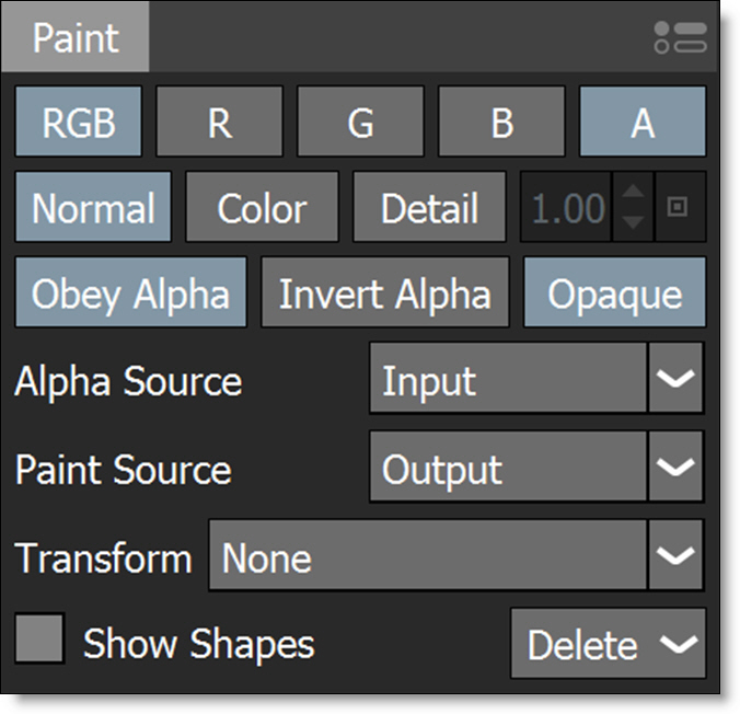 Outputs only the painted portions of the frame along with an automatically generated alpha channel (where the brush painted). This will allow you to seamlessly composite the painted areas in a Composite node without having to do a difference matte.