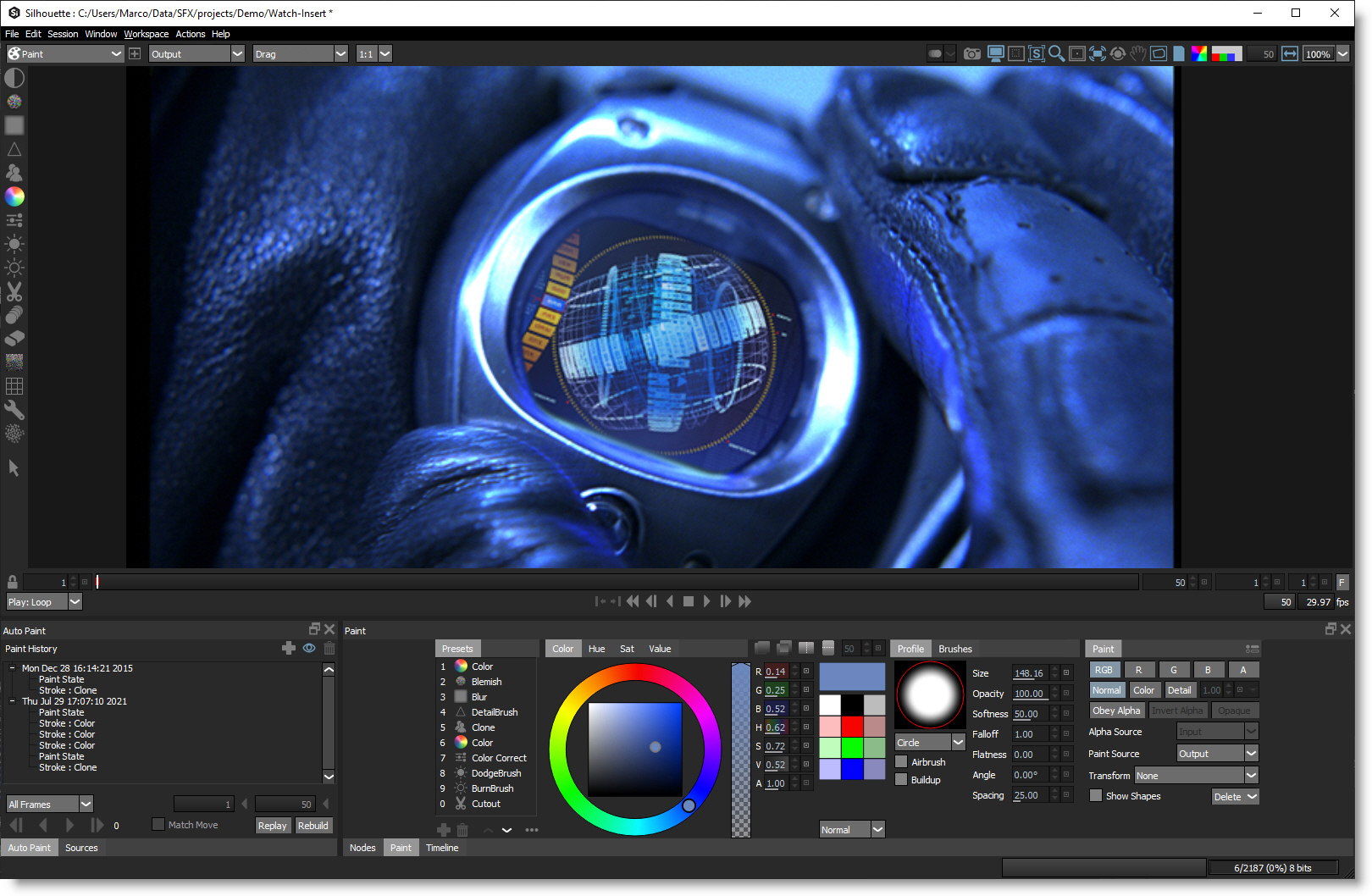 Paint is a high dynamic range, non-destructive, 2D raster based paint system designed from the ground up to handle the demands of feature film and television production. Whether it’s image restoration, dustbusting, wire and rig removal or just plain paint, Silhouette provides simple and sensible tools to get the job done.
