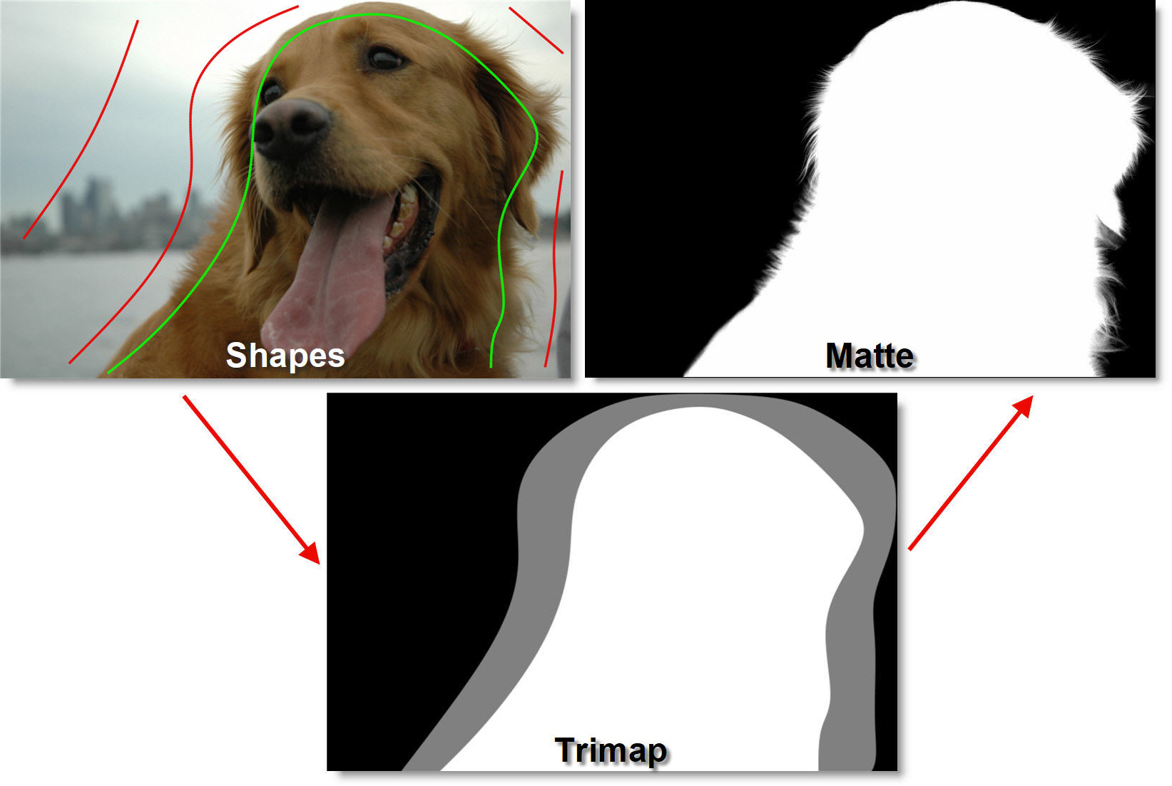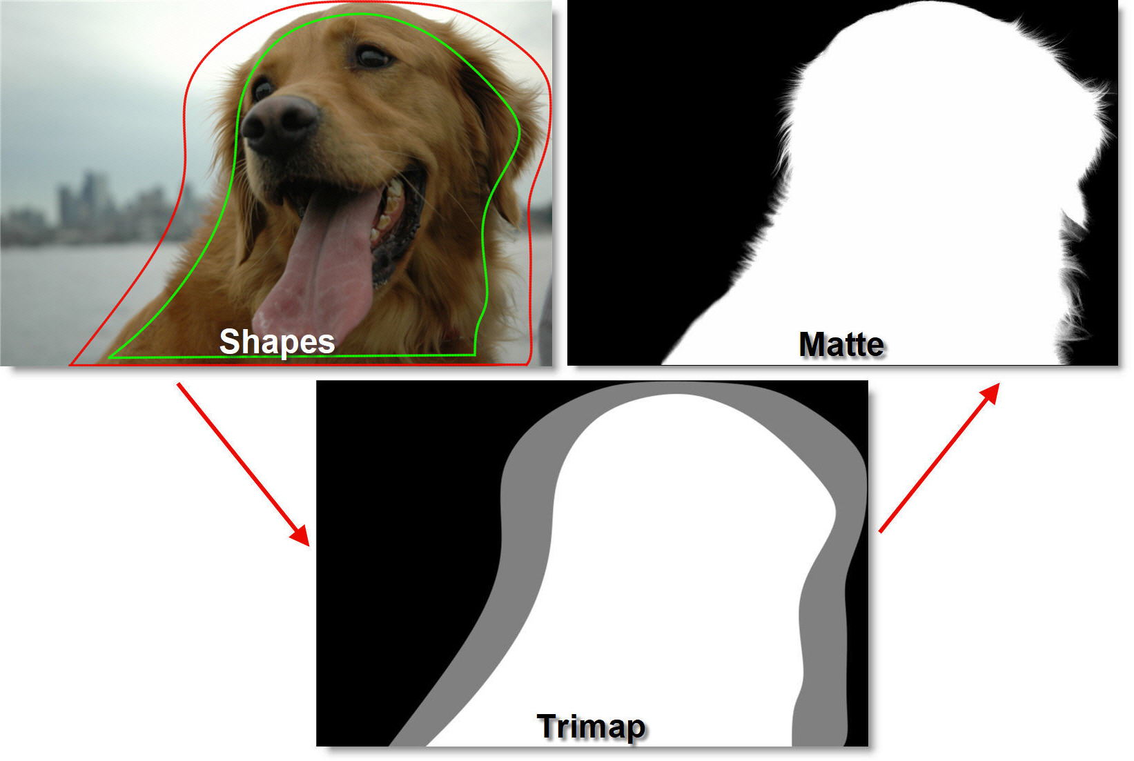 • Ideally, the unknown region (the regions not defined with foreground or background shapes) should only cover transparent pixels whose actual values are not completely foreground or background. In other words, the unknown region should include hair detail, transparent or blurry portions of the image.