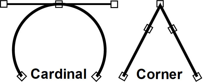 Joins can either be corner or cardinal (smooth) joins. When control point tangents are positioned in opposite directions, the join is cardinal. In contrast, corner joins have their tangents positioned at an angle to each other.