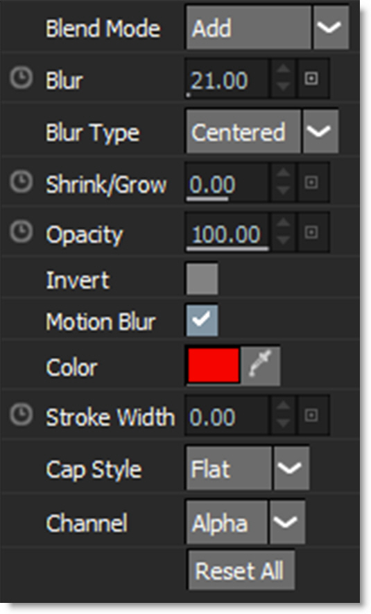 Blurs the alpha Channel. The blur range is from 0-100 and defaults to 0.