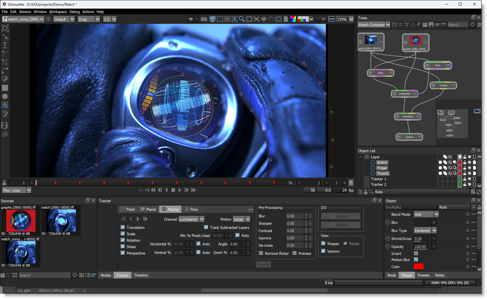 Roto allows you to quickly create sophisticated animated mattes using B-Spline, Bézier, X-Spline or Magnetic Freehand shapes. Intelligent design and easy-to-use tools, such as variable edge softness on a point by point basis and realistic motion blur, assist you in creating complicated shape animations. Integrated motion tracking makes the normally tedious task of rotoscoping a breeze.