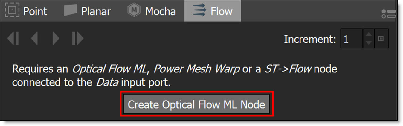Connect either an Optical Flow ML, PowerMesh Warp or a ST->Flow node to one of the Roto based node’s Data input ports and the Flow tracker becomes enabled.