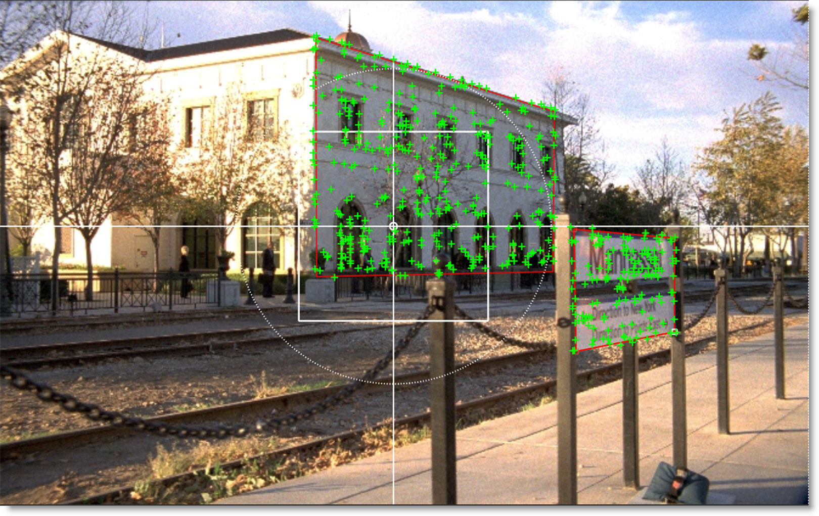 The center cross is the track point. It represents the position of the motion track. Normally, the Track Point is at the center of the tracker, but can be offset if the Match Area becomes obscured.