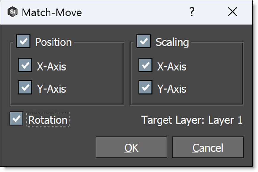 Selecting the Apply button opens the Match Move window where you determine how the tracking data will be applied.