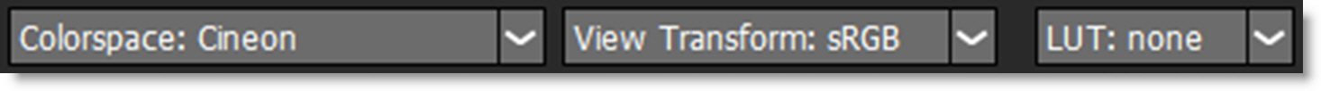 4 In the Color Management toolbar located below the Display Options icon, make sure that the Colorspace is Cineon and the View Transform is sRGB.