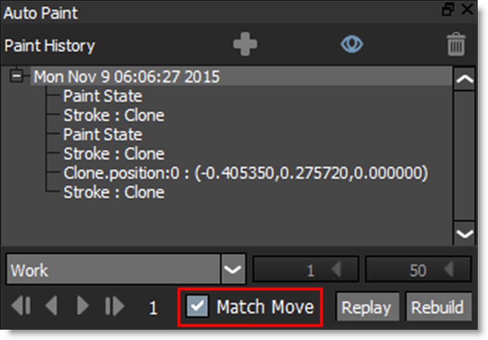 The Rebuild feature in the Auto Paint window will rebuild the paint events for all frames defined in the Frame Range in the order in which they were painted. This is useful if you replace your footage with a different color correction than the original and want the result of painting with the Clone brush to match the new footage.