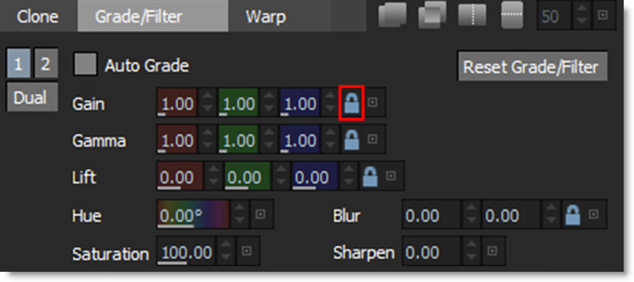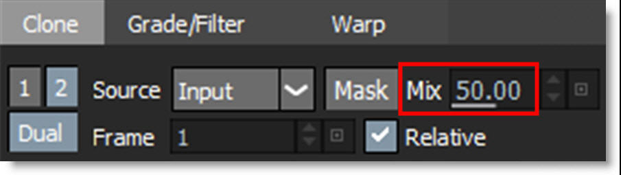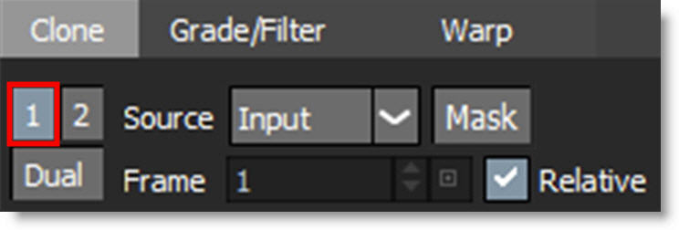 Paints with sampled pixels from an image with the ability to grade (color correct), blur, sharpen or warp the clone source.