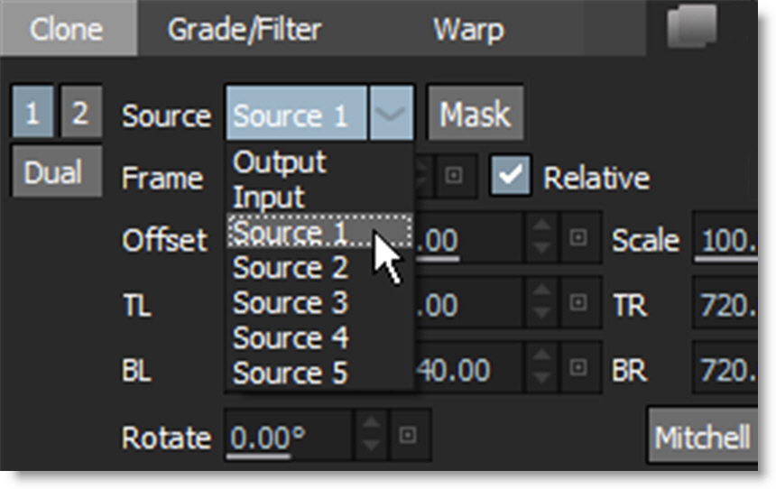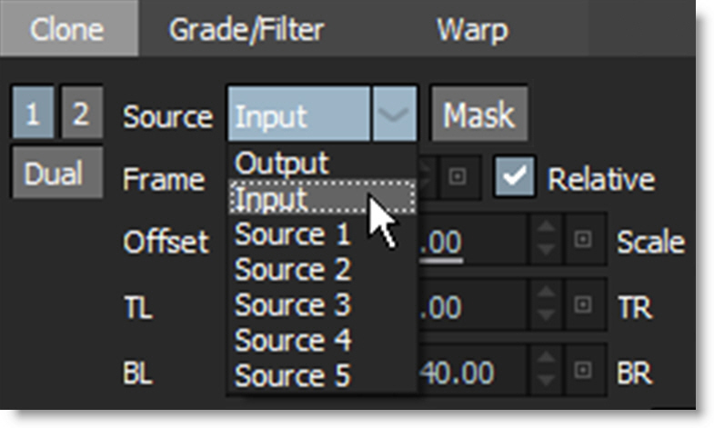 2 In the Clone controls, select Output, Input or Source 1-5 in the Source pop-up menu.