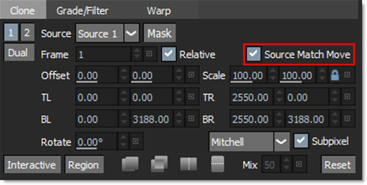 10 Enable Source Match Move in the Clone transform controls.