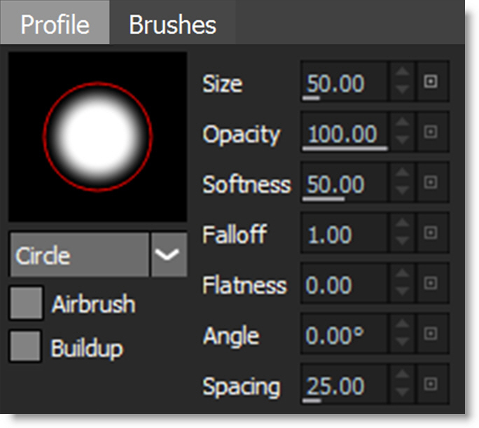 7 In the Paint window’s Profile tab, adjust some of the settings to see how it changes your brush.