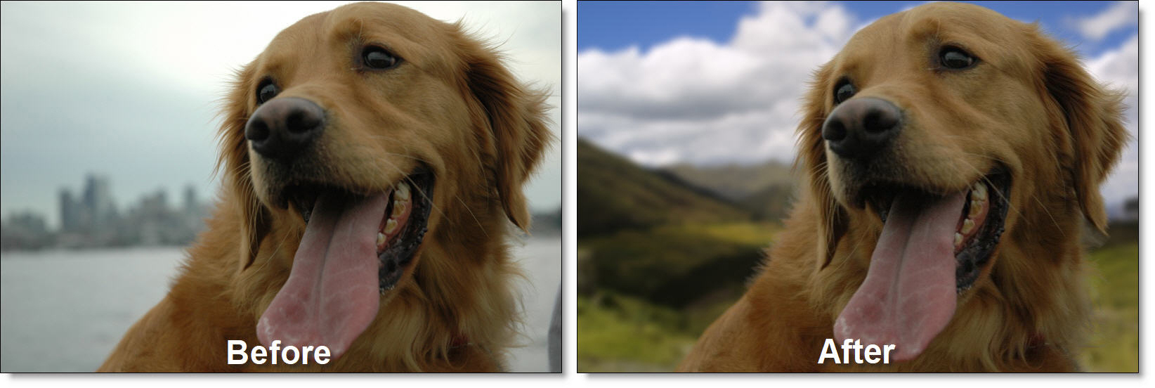 If you look closely at the edges of our dog example, you will see some white fringing created by the sky from the original image. By activating Power Matte’s Color Estimation feature, the fringing can be removed by estimating the color of the foreground in unknown and semi-transparent areas.
