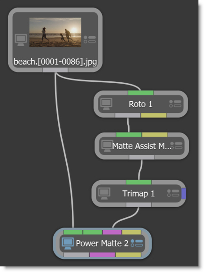6 Connect the source to the Power Matte input and the Trimap node into the Power Matte > Aux Matte input.