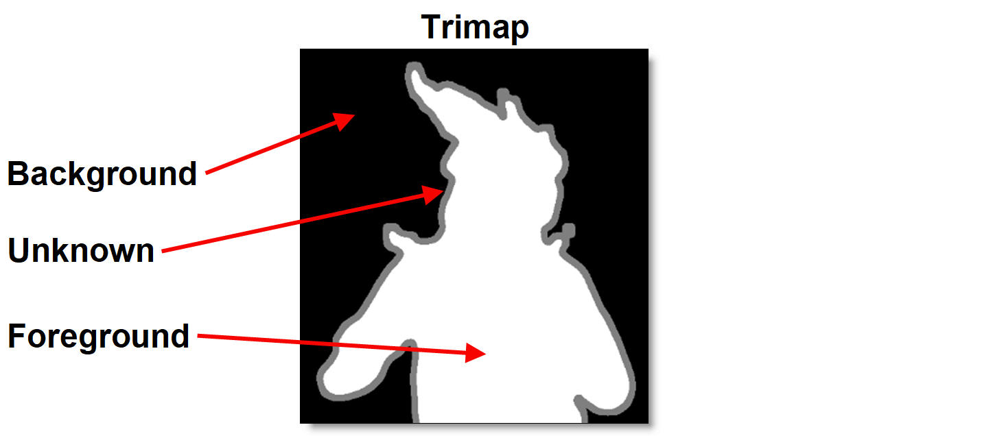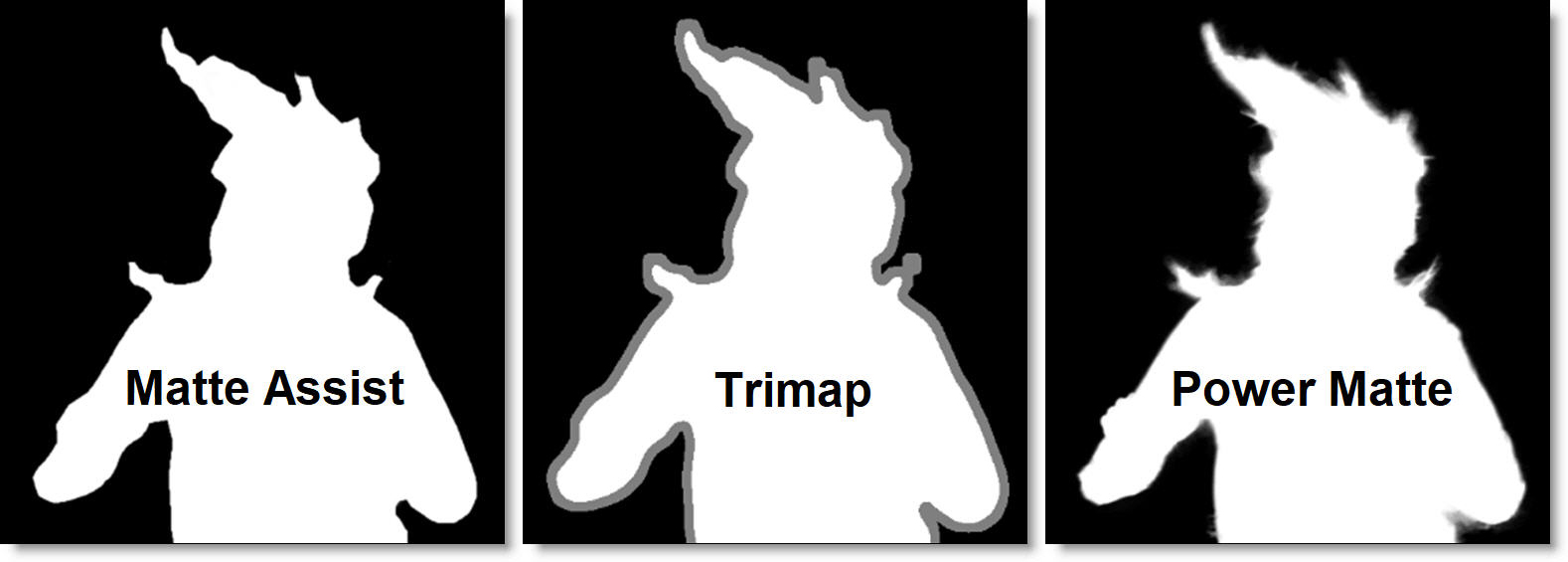 Power Matte can process with an optional trimap input. Trimaps are pre-segmented images consisting of three regions of foreground, background and unknown (neither foreground or background). Partial opacity values are then computed only for pixels inside the unknown region.