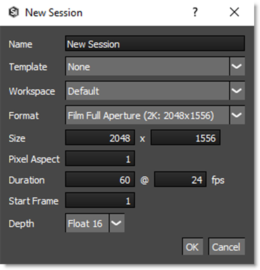 You must create a session before you can start working with your footage. It describes the resolution, bit depth, duration, frame rate and aspect ratio as well as what nodes you will be using. You can create a new session by:
