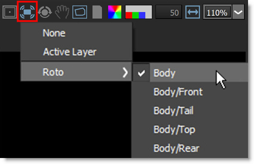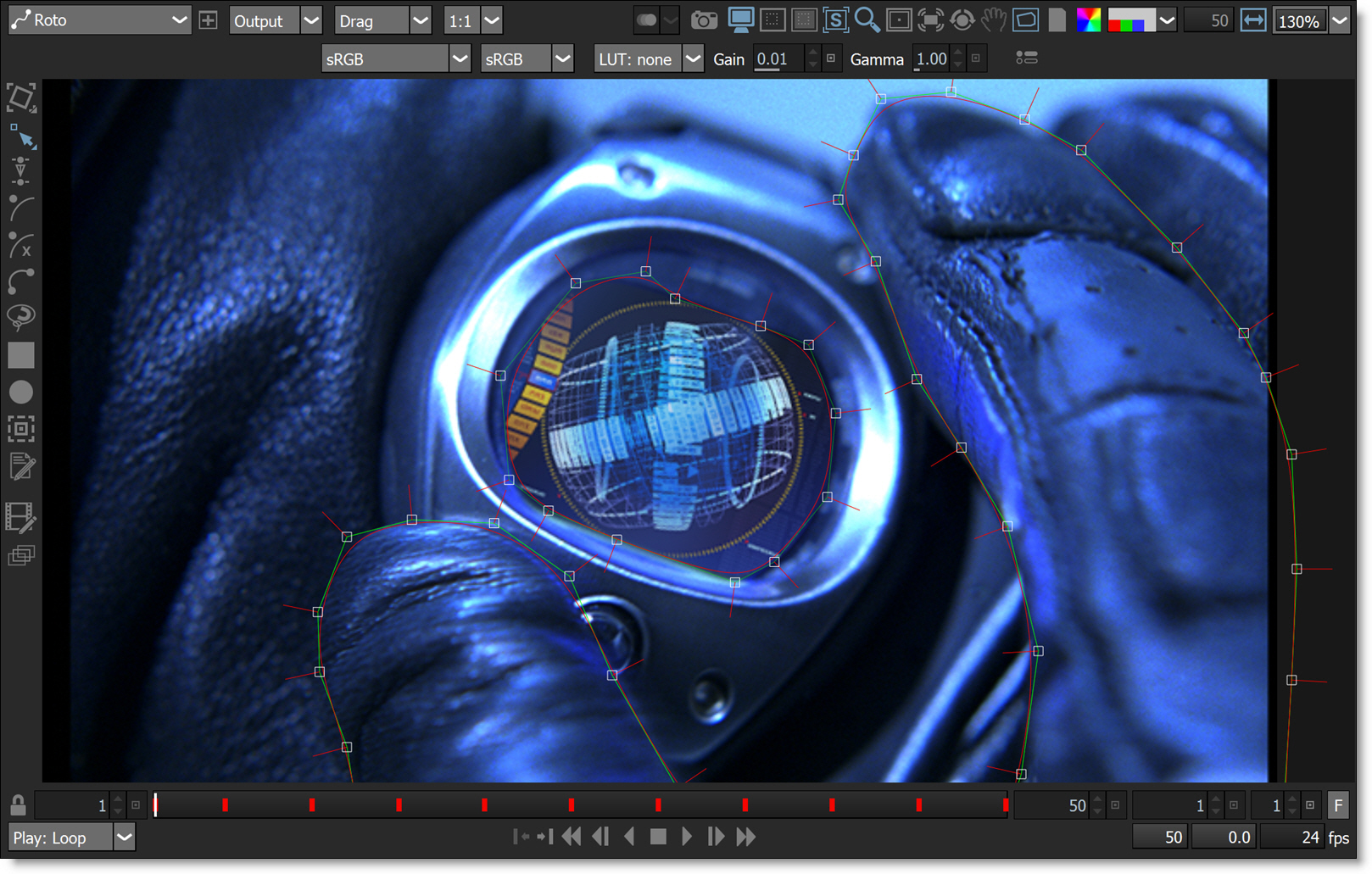 Silhouette uses a Viewer for image editing as well as for clip playback. Some features include: viewing individual color channels, the simultaneous display of RGB and alpha channels, the selection of stereo views as well as the superimposition of shapes over images.
