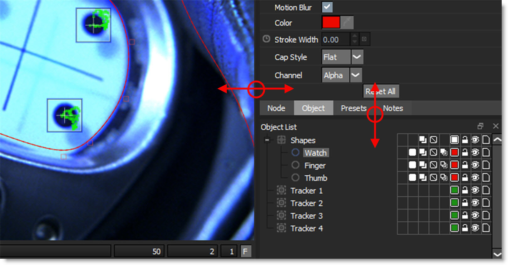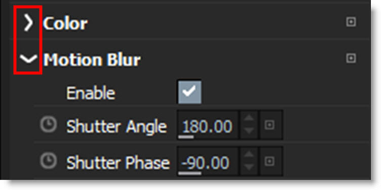 Effect groups in the Node and Object parameter windows can be expanded and collapsed using the angle bracket icons located to the left of the group.