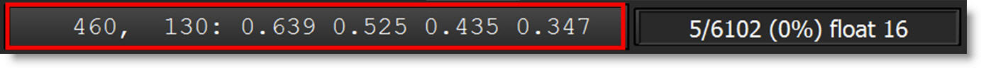 The cursor position color values are shown in the Color Sample staus bar at the bottom right of the screen. From left to right, X/Y coordinates and then red, green, blue and alpha values are displayed.