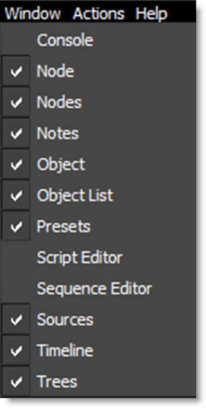 • If you drop the window in the center of an existing window, a tab will be created so that both windows will share the same space. This is the same as the Node, Object, Presets and Notes windows sharing the same location.